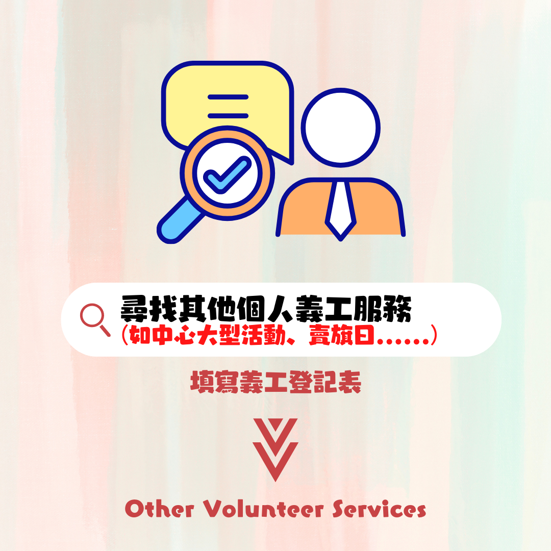 找一個你有興趣及合適的義工機會 如欲尋找其他個人義工服務(如中心大型活動、開放日、賣旗日等),請填寫義工登記表。 中心職員稍後直接與你聯絡,謝謝!!